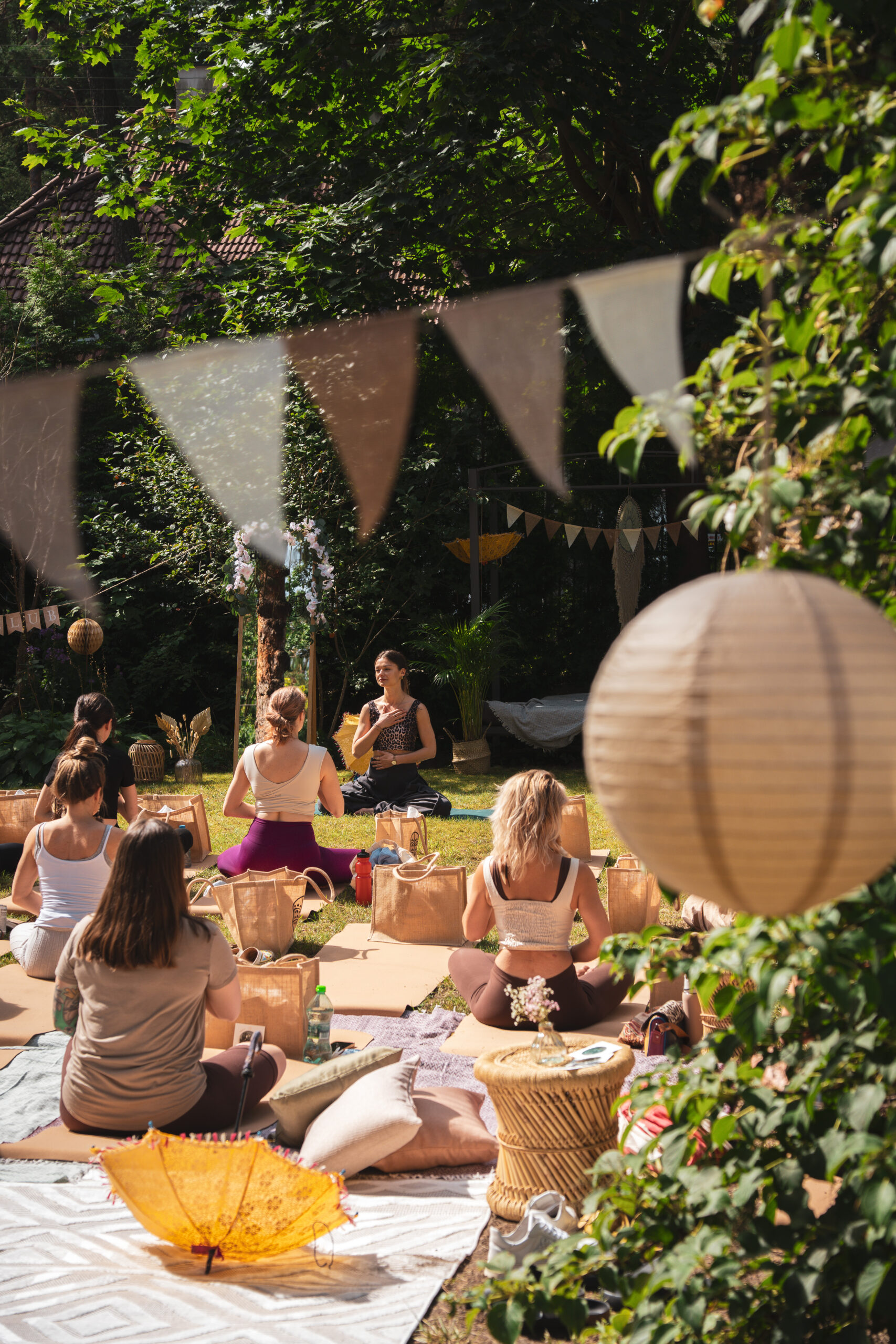 Poranek rozpoczyna się w ogrodzie – pod zadaszeniem wśród zieleni. Witamy się w kobiecym kręgu i wspólnie zapraszamy intencję na ten dzień. Nie ma presji, nie trzeba nic mówić. Wystarczy być.